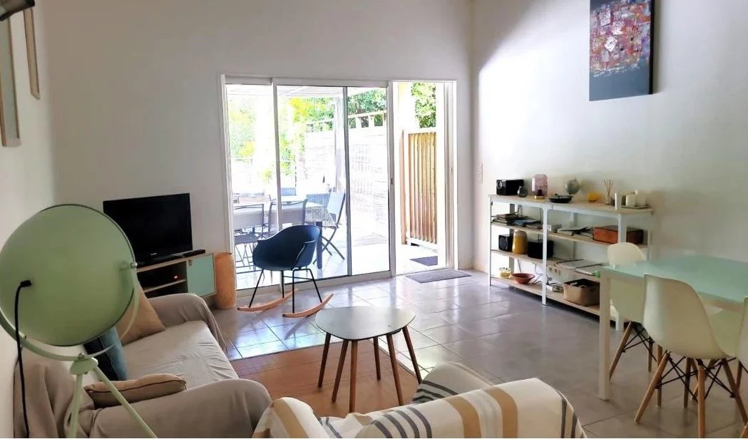 •Une pièce de vie spacieuse avec salon, salle à manger et cuisine ouverte équipée, prolongée par une terrasse semi-couverte, parfaite pour les repas d’été.