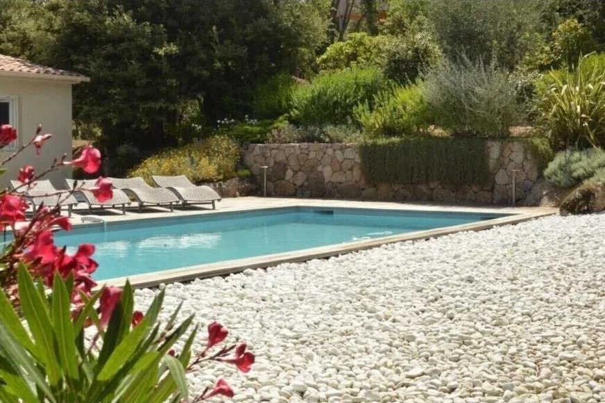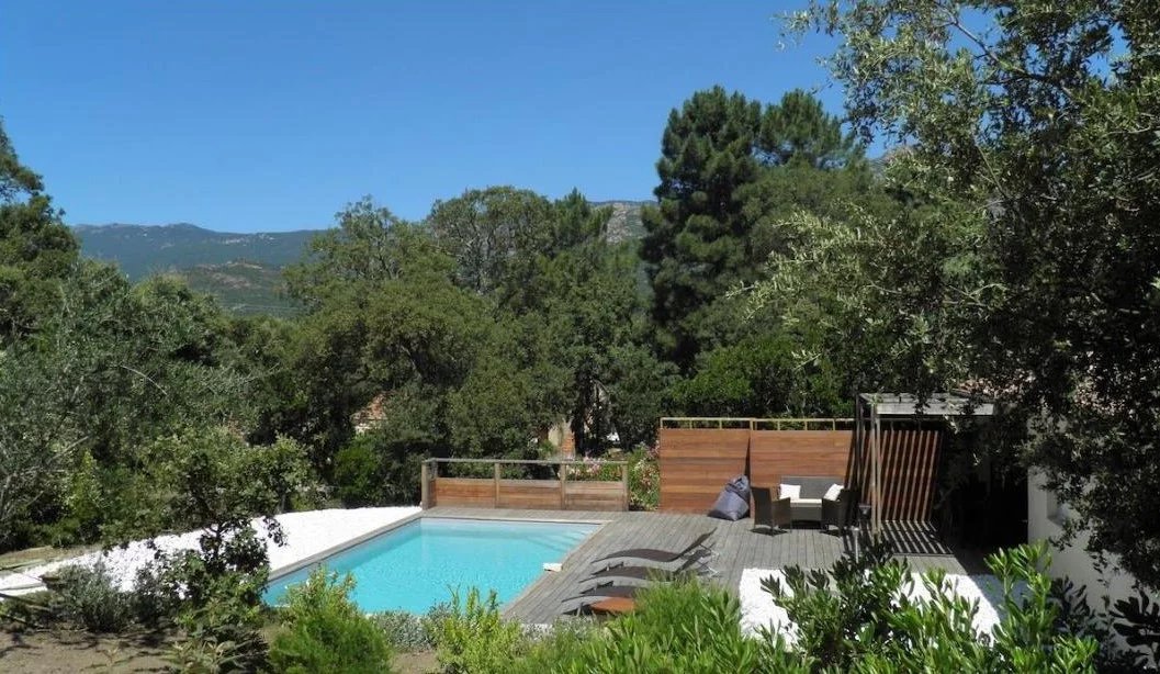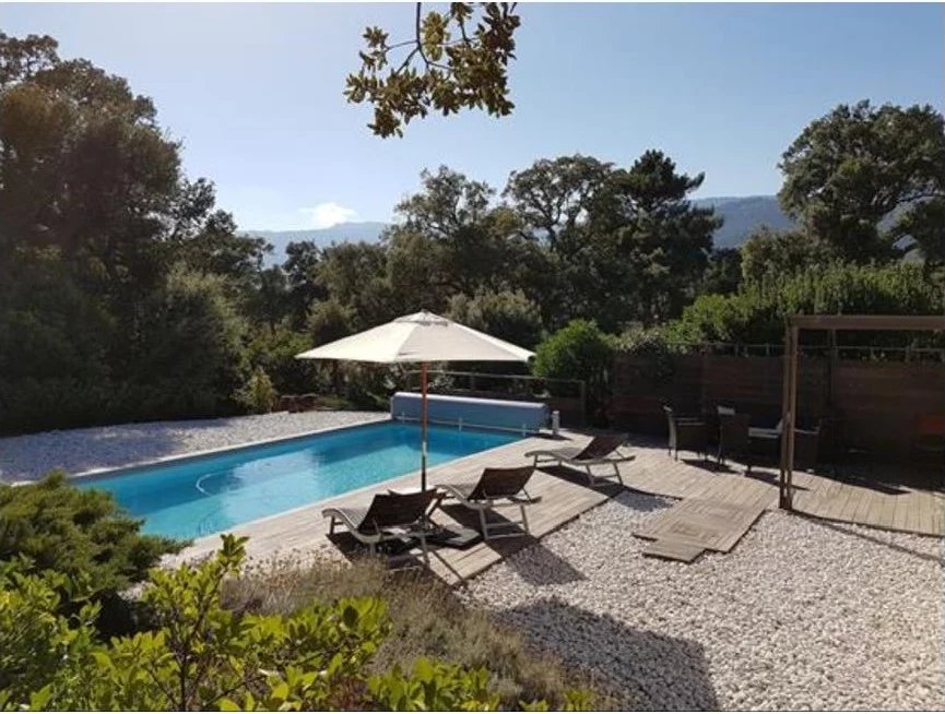 Le jardin soigneusement aménagé accueille une piscine béton au sel (9×4 m), sécurisée par un volet roulant, entourée d’une terrasse en bois exotique (IPE) — un véritable havre de paix pour profiter du soleil corse.